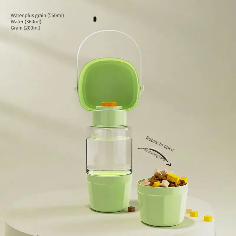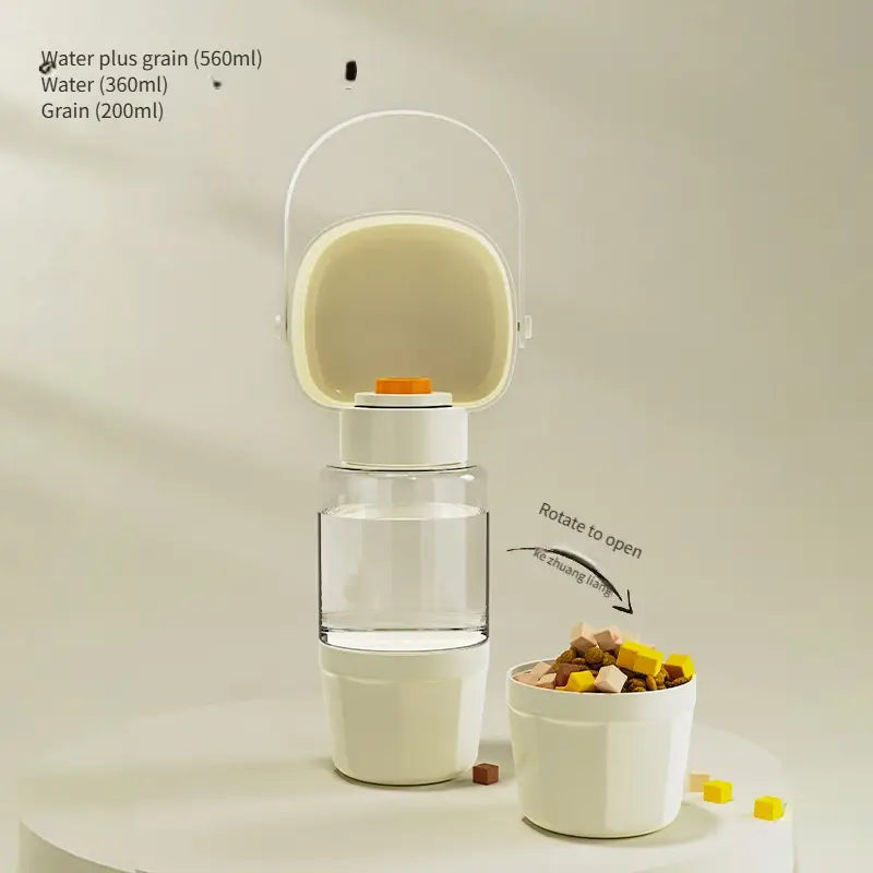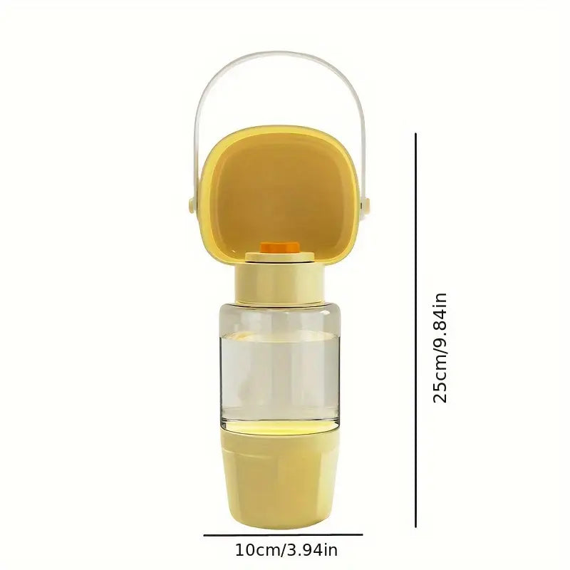 UNA BORRACCIA D'ACQUA PORTATILE PER ANIMALI DOMESTICI, DOPPIA FUNZIONE BICCHIERE E PORTA CROCCHETTE.